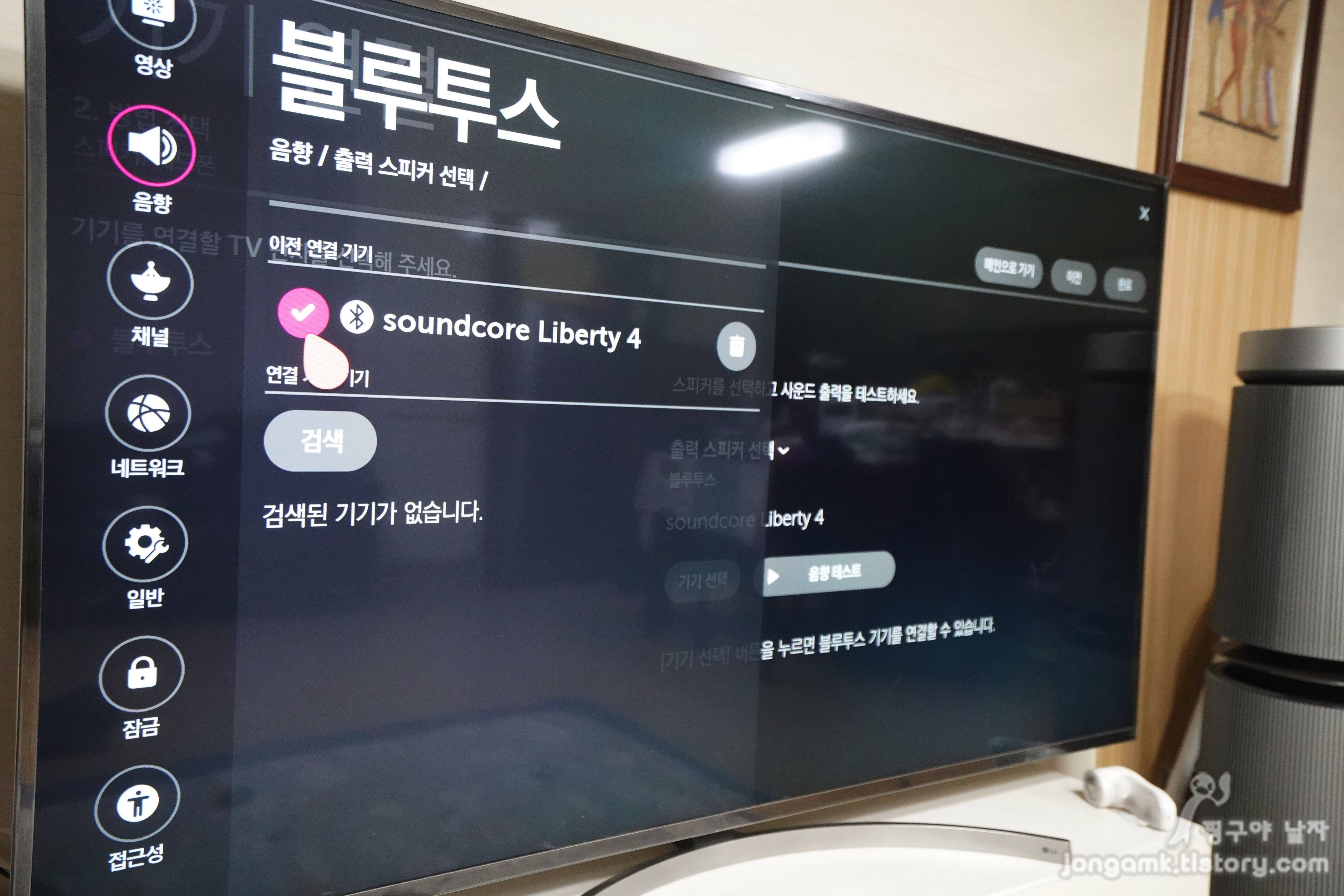앤커 사운드코어의 무선이어폰 리버티4를 TV와 연결해서 사용하고 있는데요. 몇 년전에 출시한 스마트TV라면 블루투스 기능이 있어 연결해 사용할 수 있을 가능성이 높습니다.