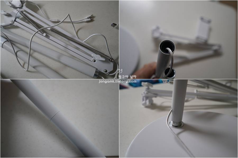 구성품은 원형 받침대, 양방향 헤드, 위아래 탄소강봉, 거치대와 충전케이블 그리고 조립설명서로 되어 있습니다. 조립설명서를 보고 찬찬히 조립을 하면 됩니다.