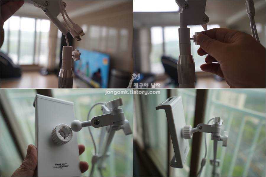 참고로 12인치대 태블릿까지 가능한 스톤힐 스탠드 거치대는 블랙과 화이트 2가지 컬러가 있어요. 조립을 하는 데는 어렵지 않은데 상하 탄소강봉을 연결할 때 참고할 사항이 있어요.