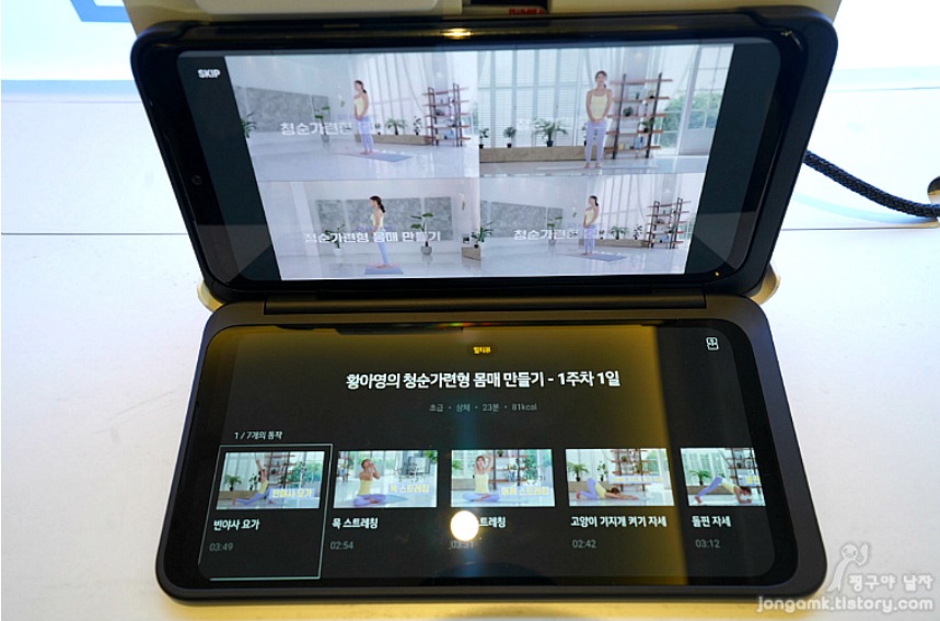 엘지 스마트캠은 스마트폰으로 홈트레이닝 코칭 영상을 보면서 운동을 했었는데 좀 더 확대된 개념으로 볼 수 있습니다. 따라서 스마트폰 보다 큰 화면으로 사용할 수 있다는 장점을 누리고 싶은 니즈를 채울 수 있을 것 같아요.