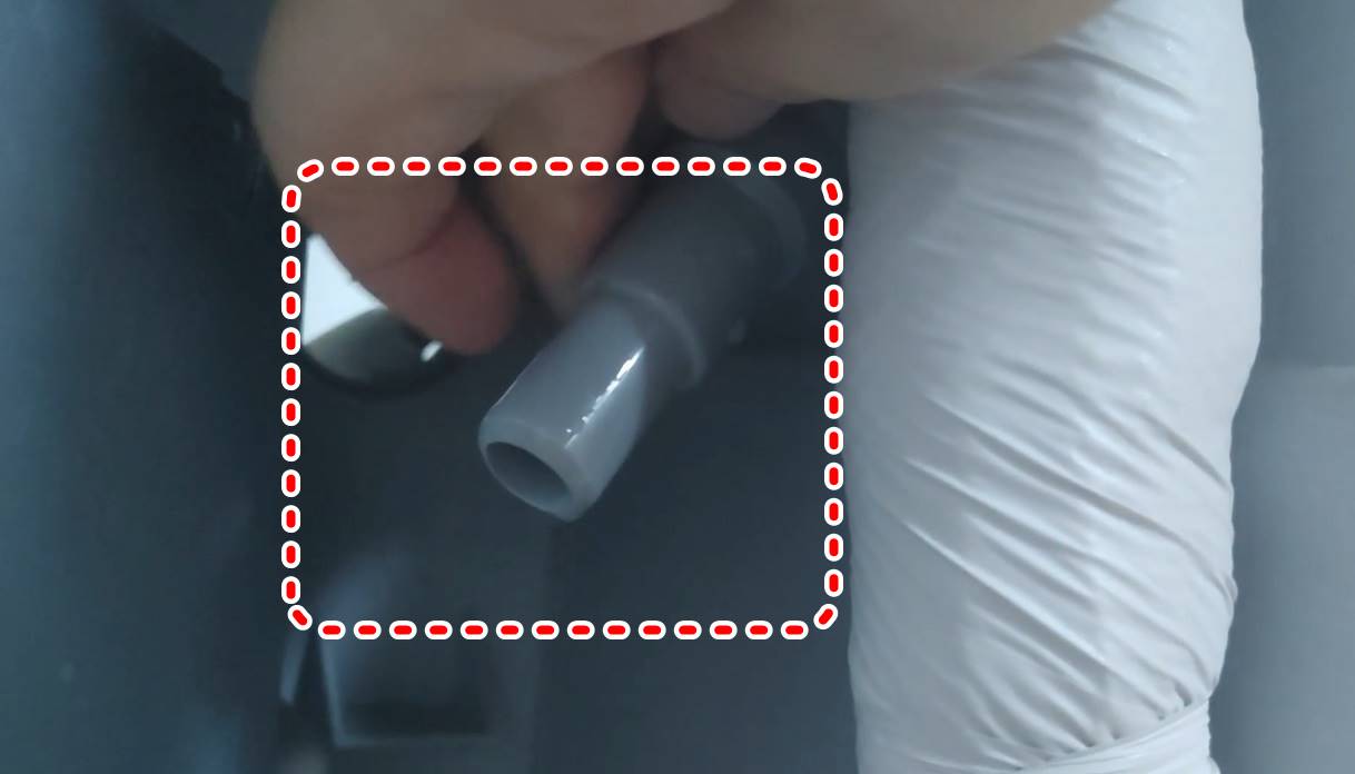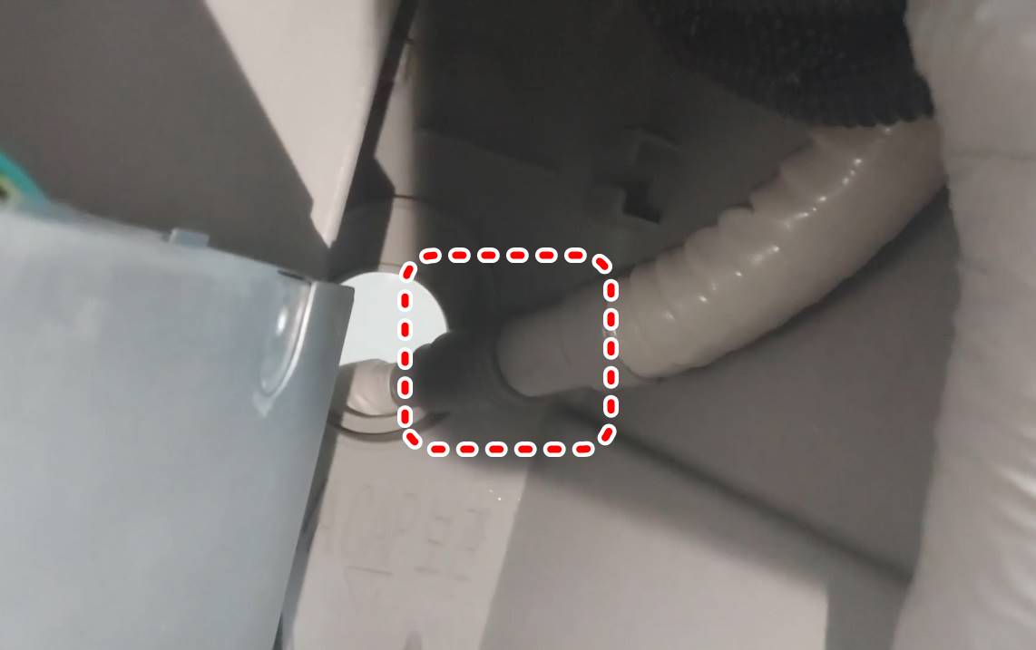 분해된 하단 분의 우측 아래를 보면 안쪽에 주름 호스가 보입니다. 엘지 인공지능 스스로에어컨 본체에서 나온 호스와 실외기로 연결된 호스 연결부분을 찾습니다.
