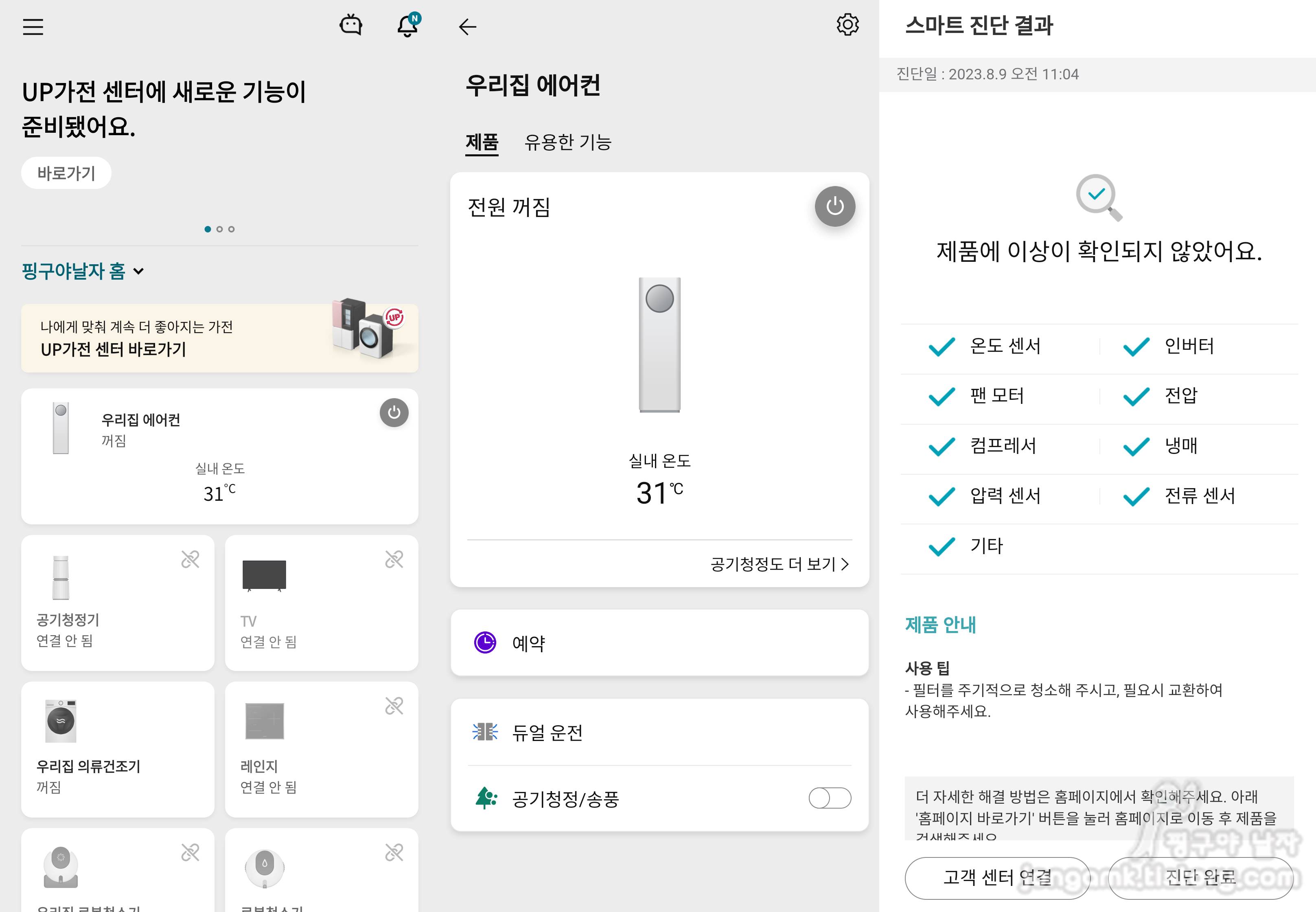 누수원인을 찾기 전에 LG ThinQ 앱으로 상태를 접검해 보았습니다. LG THinQ 앱과 연동이 되어야 사용할 수 있으니 연동되지 않은 분들은 먼저 연동하셔야 합니다.