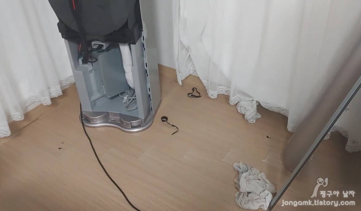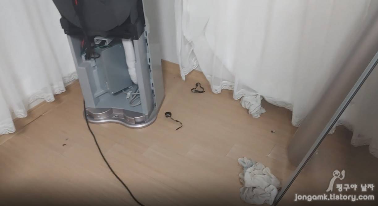 개인적으로 전면부 하단 판넬을 분해하고 하단부의 아랫부분에 있는 물이 빠져나오는 호스 부분만 건드렸습니다. 스탠드 에어컨의 누수 원인은 냉매, 호스 막힘 등 다양한 원인이 있기 때문에 참고하셔야 합니다.