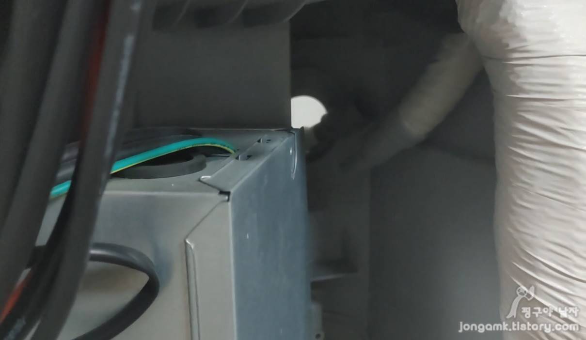 보통 검은색 절연 테이프로 이음새 부분을 연결해 놓았을 텐데~~ 설치기사에 따라 다를 수도 있겠죠, 절연테이프를 제거하고 호스를 분해했습니다. 중간 부분을 살살 돌리면서 잡아 빼면 됩니다.