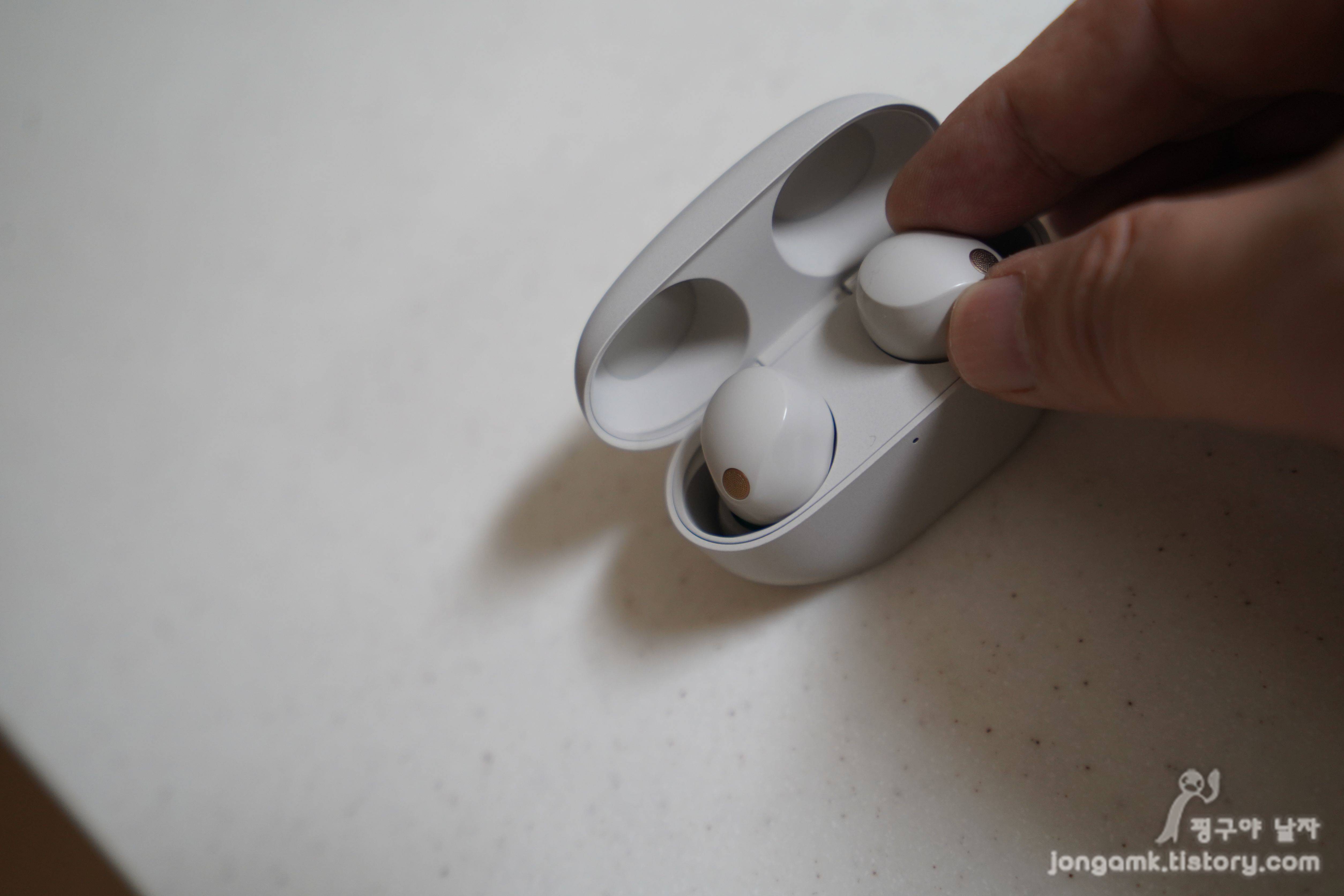 그런데 충전케이스에서 이어버드를 꺼낼 때 측면이 유광으로 처리되어 있어 미끌거렸습니다. 이는 부드러운 착용감과 고급스러움을 위한 디자인이겠지만 몇 번을 놓쳤는지 모릅니다. 이는 단점이라면 단점일 수 있습니다. 그래서 지금은 사진처럼 잡지 않고 윗부분을 깊숙하게 잡아 사용하고 있답니다.