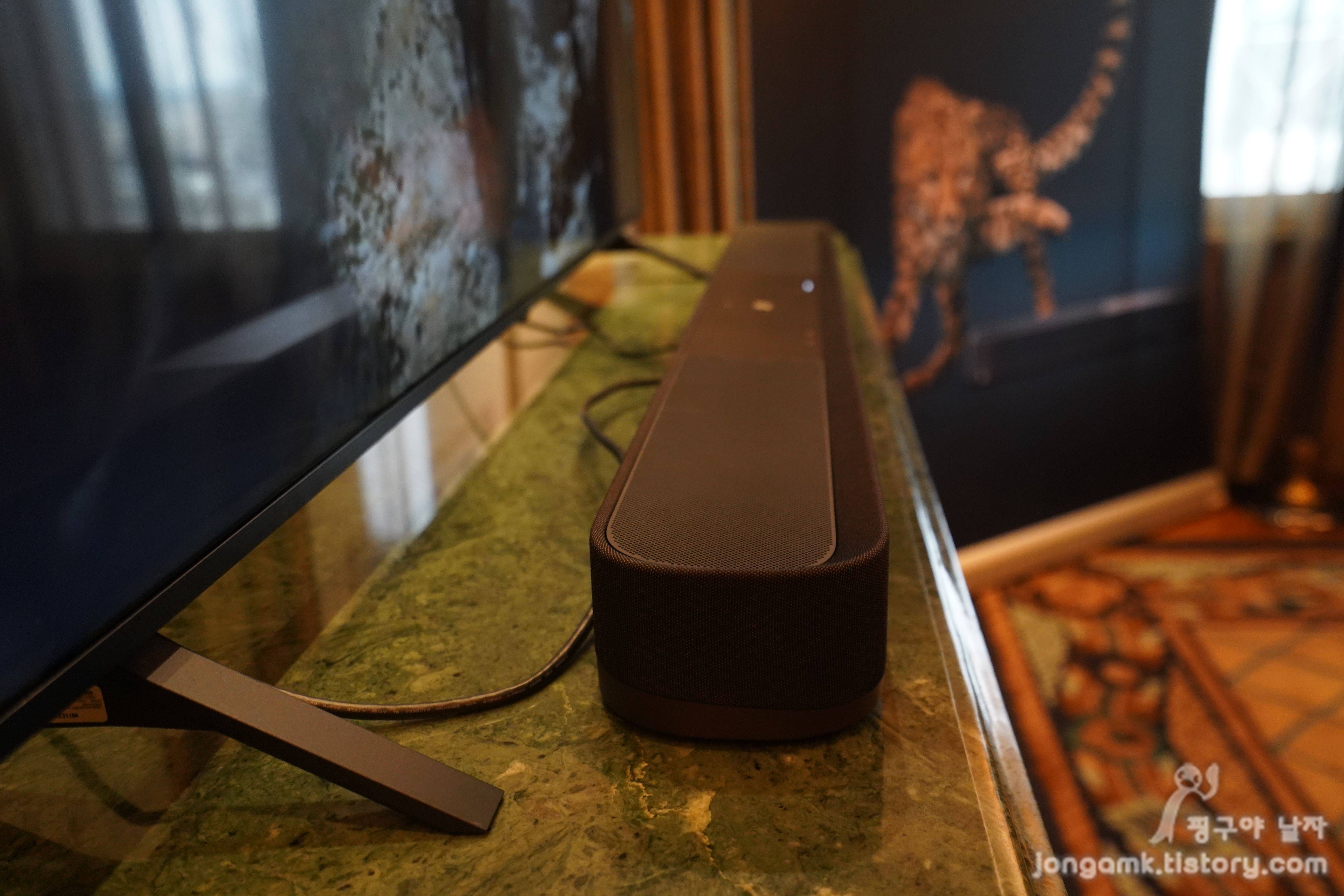 서브우퍼를 OFF 한 상태에서는 아무래도 밀폐형 타입의 앰비오 서브우퍼의 27Hz에 이르는 극저음이 깔아 주는 느낌은 볼륨은 낮출수록 차이를 더 잘 느낄 수 있었는데 이를 감안하더라도 타사의 사운드바와의 차이는 분명했습니다. 아마도 3D 음향기술인 앰비오 덕분이겠죠.