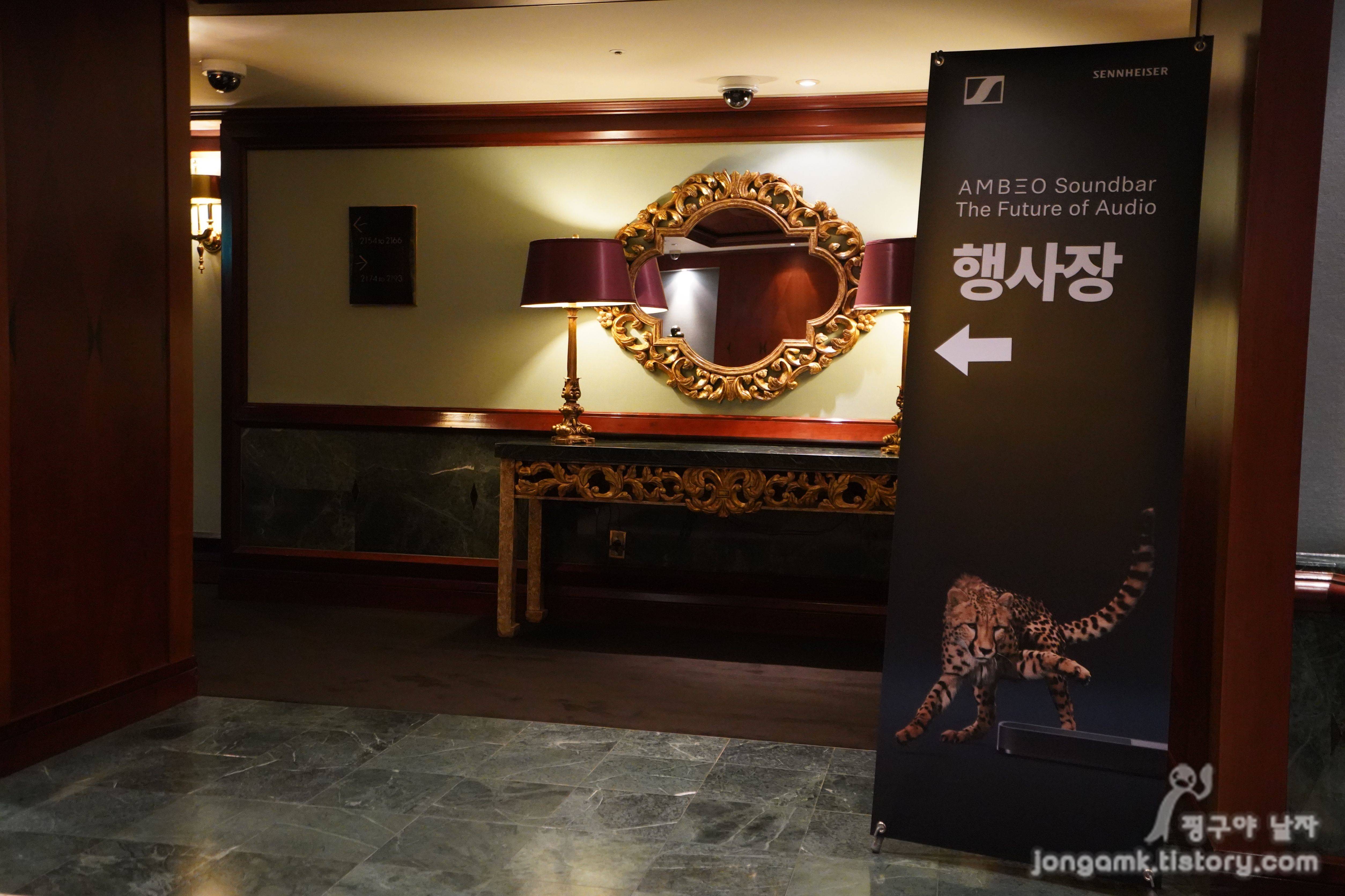 더플라자호텔 21층 로열플라자 스위트 입구에 행사장을 알리는 입간판의 치타의 모습은 강렬하면서도 섬세한 느낌의 사운드를 제공하는 앰비오 사운드바 플러스와 코드가 맞는 것 같았습니다.