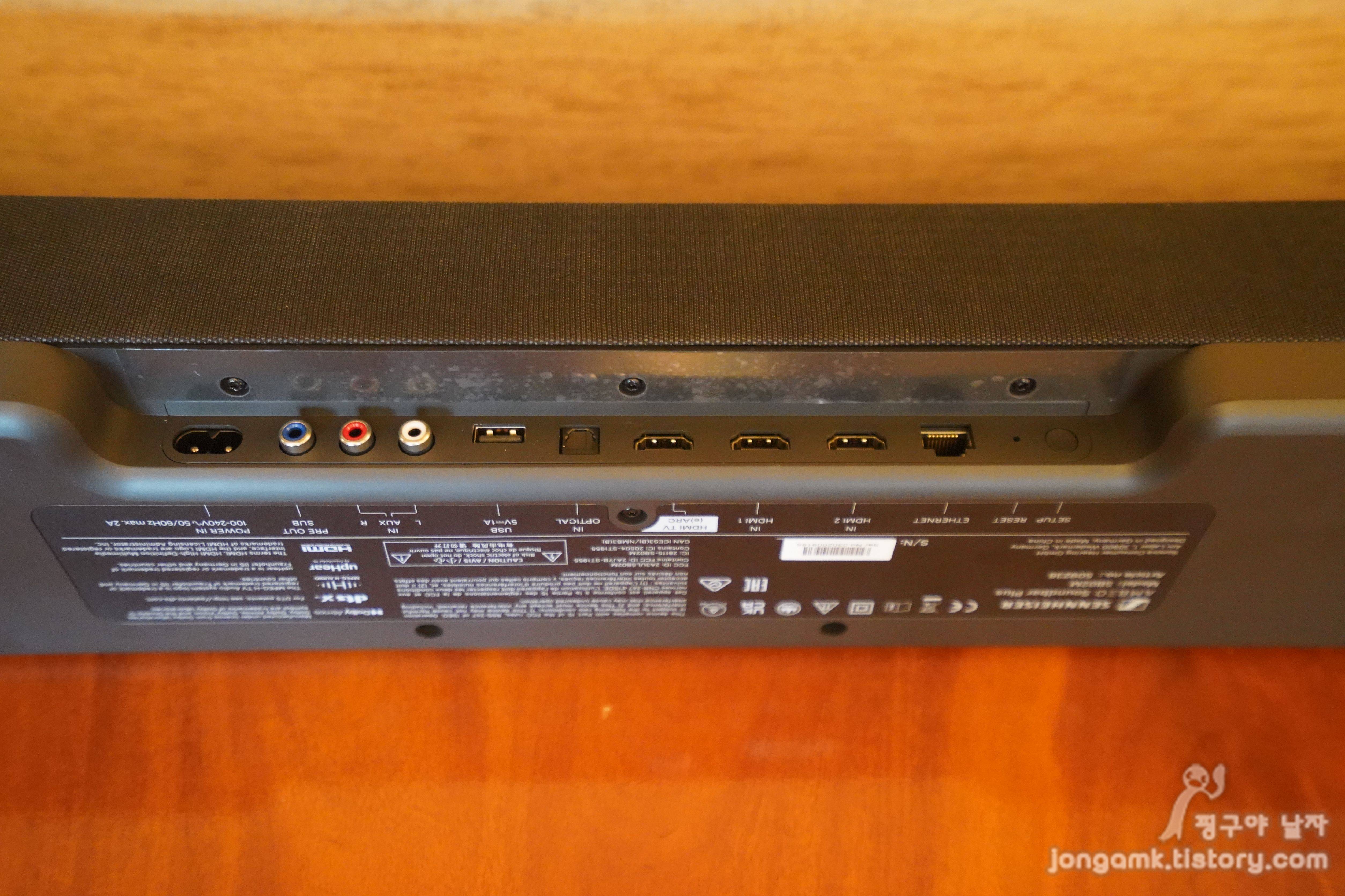 후면 하단에 전원잭을 포함한 다양한 포트를이 있으니 디바이스에 맞게 연결해 사용하면 됩니다. 젠하이저 앰비로 사운드바 플러스의 가격은 229만원이며 앰비오 서브우퍼의 가격은 129만원으로 모두 갖추면 358만이 되겠죠.