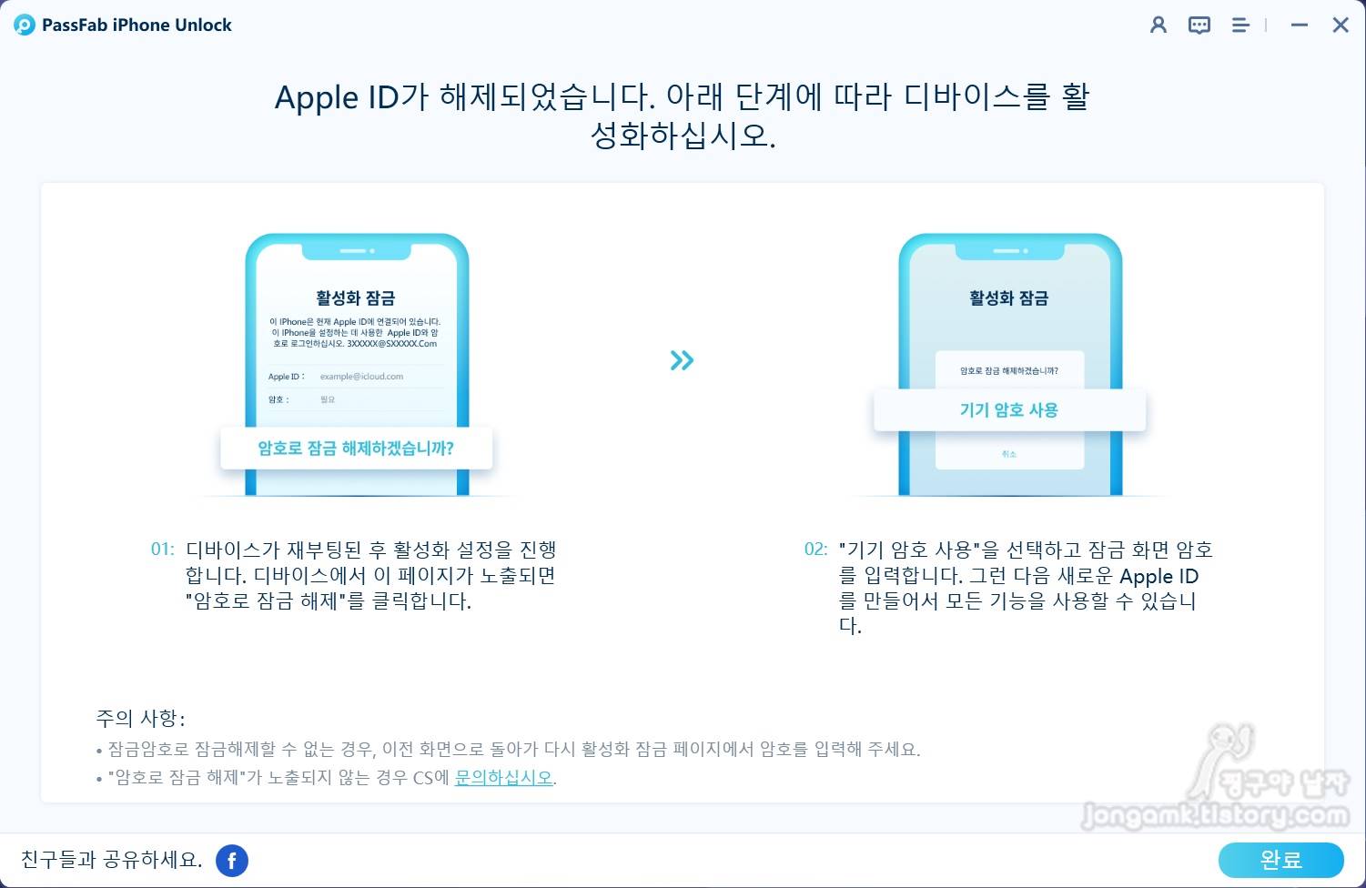 와우~ 암호가 성공적으로 해제가 되었다고 메시지나 나타났습니다. Facebook 공유는 자랑하고 싶으시면 사용하시고 그렇지 않고 빨리 아이폰 상태를 확인하고 싶다면 완료로 마무리하면 됩니다.