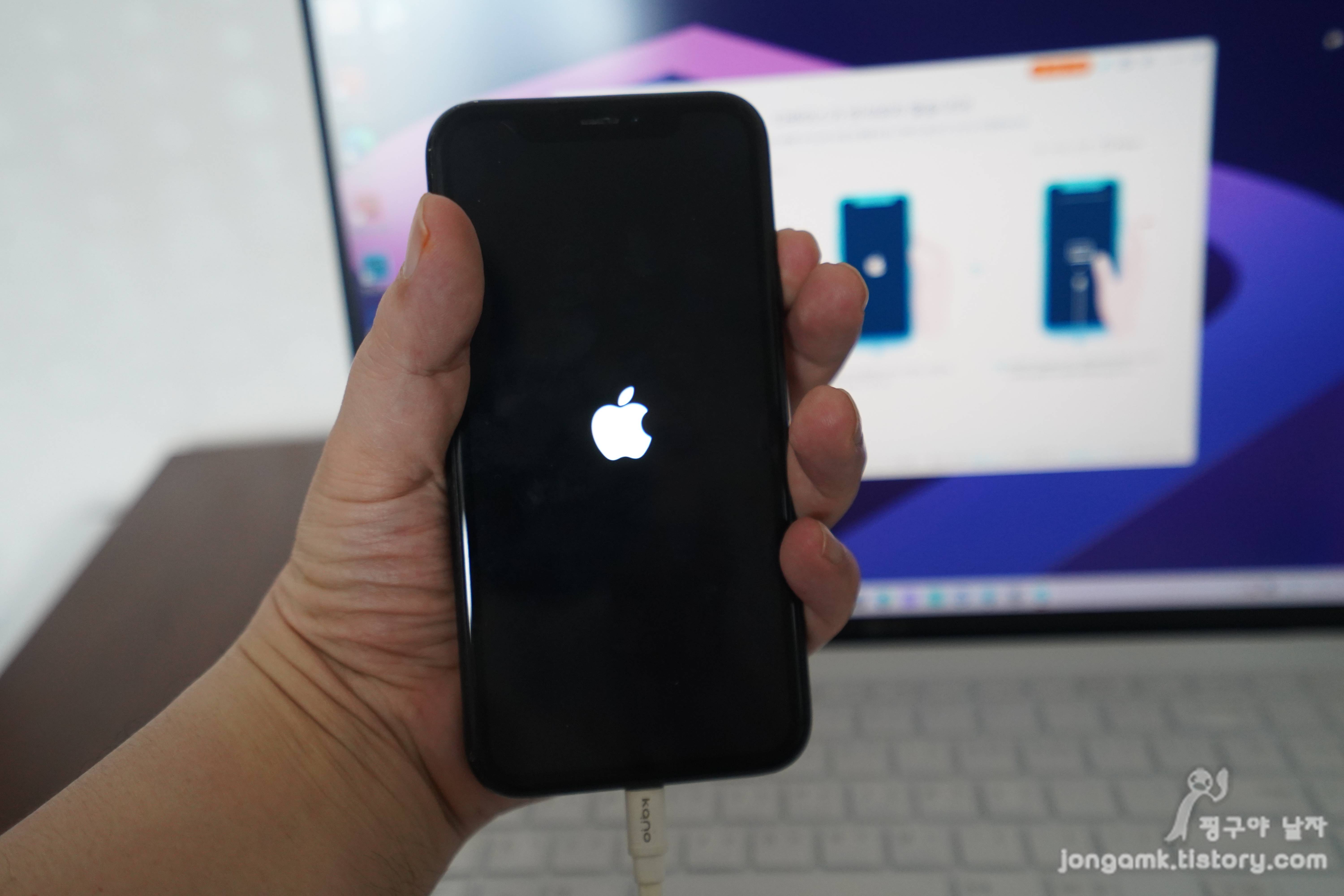 애플로고가 나오고 ITunes 또는 컴퓨터에 연결 로고가 나타날 때까지 전원버튼을 길게 눌러 줍니다. 성격이 급한 분들은 좀 더 인내하고 누르고 있어야 합니다. ㅋㅋ 전원버튼을 다시 눌렀다면 처음부터 다시 해보세요.