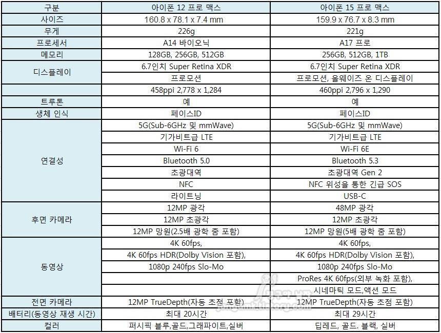 아이폰12 프로 맥스와 아이폰15 프로 맥스의 스펙을 간단한 비교표로 만들어 보았ㄴ으니 참고하면 도움이 되지 않을까 싶습니다.