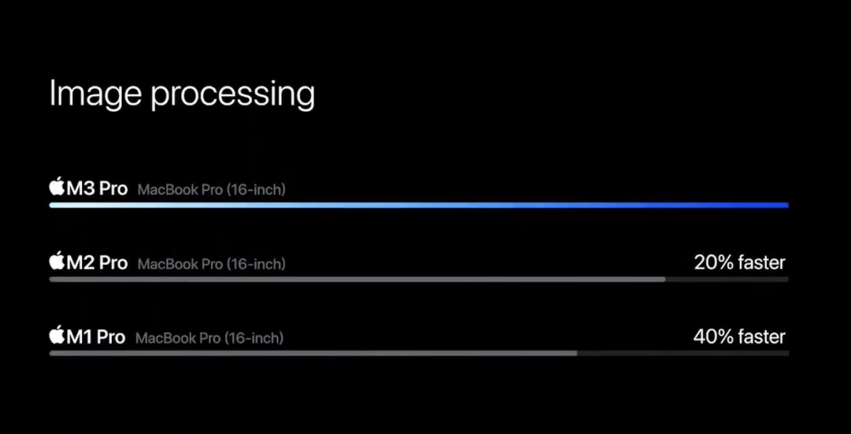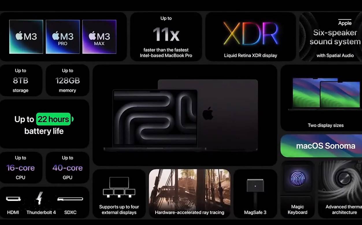 M3 라인업에서 애플이 제일 자랑하고 싶은 것은 M3 맥스로 16코어 CPU(성능 12개, 효율성 4개), 40코어 GPU 및 최대 128GB 통합 스토리지를 지원합니다. M3 맥스는 M1 맥스보다 무려 50% 더 빠르며, 그래픽 자체의 성능은 80% 더 향상되었습니다. 그리고 M2 맥스가 작년에 이전 제품보다 30% 더 빨랐다는 점을 고려하면 엄청나게 향상된 수치입니다.