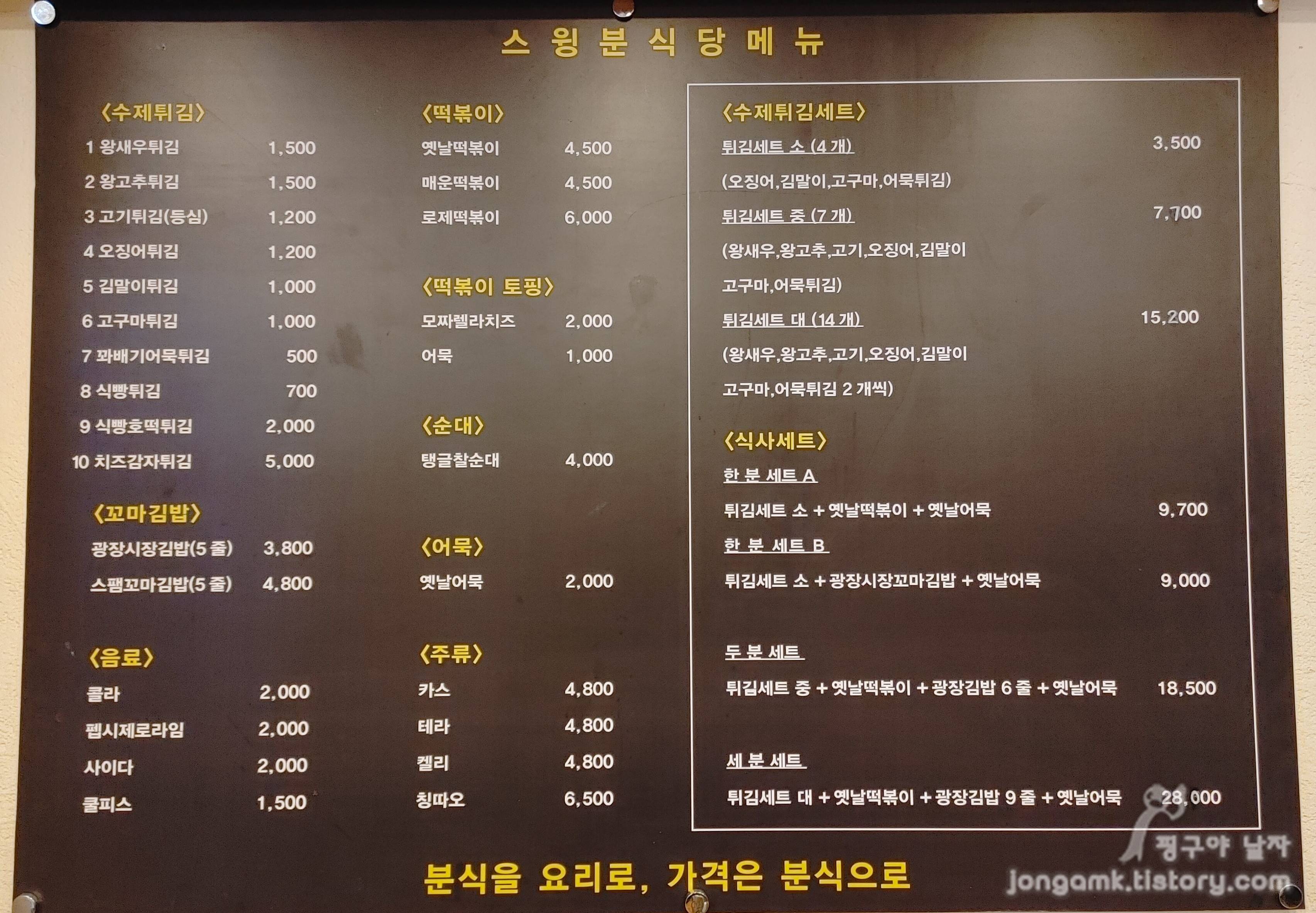 막상 들어가 메뉴판을 보니 수제튀김 종류만 10가지(왕새우튀김, 왕고추튀김, 고기튀김(등심), 오징어튀김, 김말이 튀김, 고구마튀김, 꽈배기어묵튀김, 식빵튀김, 식빵호떡튀김, 치즈감자튀김) 꼬마김밥 2가지 그리고 떡볶이도 종류가 3가지였어요. 선택결정에 장애가 ㅋㅋ 있는 분들을 위해 수제튀김세트와 식사세트를 준비해 스윙분식당은 일반 분식집과 다르는구나 뭐~ 그런 생각이 들었습니다.
