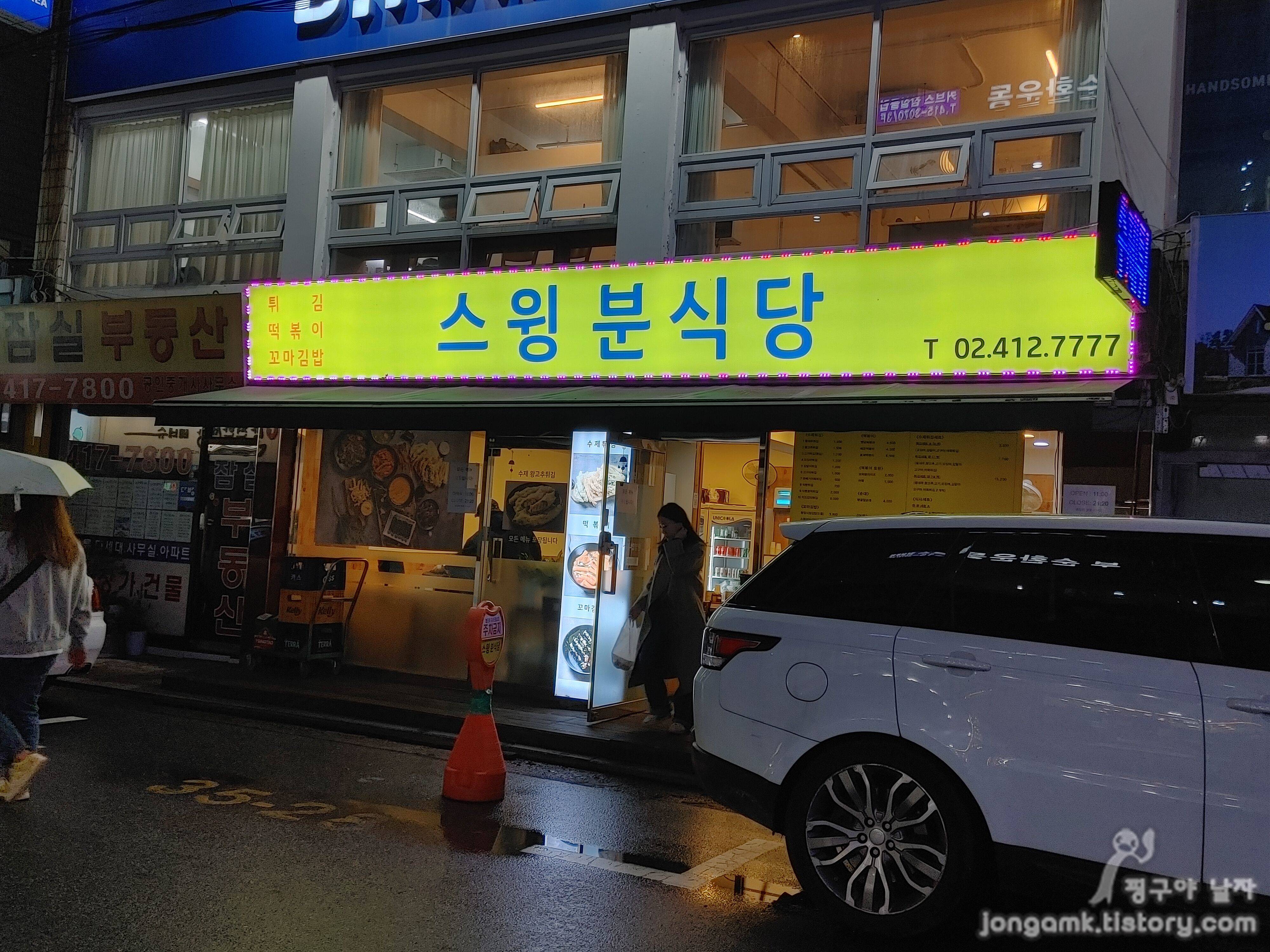 잠실새내역 4번 출구 인근에 있는 스윙분식당은 튀김 맛있는 집이라고 추천을 받아 지인들과 겸사겸사 찾았습니다. 튀김이 맛있어봐야 얼마나 맛있겠어~ 뭐 그런 마음으로 찾았다가 스윙분식당의 뜻밖의 스토리에 놀라게 되었습니다. 갑자기 추워진 날씨에 따뜻한 오뎅국물 아니지 어묵국물이 생각나도 찾을 수 있는 잠실새내역 4번 출구 인근에 있는 스윙분식당은 상호부터 남다는 느낌입니다. 스윙분식이라고 할 만도 한데 당을 붙여 스윙분식당이라니!! 상호부터 뭔가 센스와 음식에 대한 철학이 있는 것 같았어요. 분식집에 무슨 철학이냐고 읍소할 분도 있겠지만 스윙분식당의 스토리를 들으면 다른 느낌으로 튀김과 떡볶이를 먹게 될 겁니다.