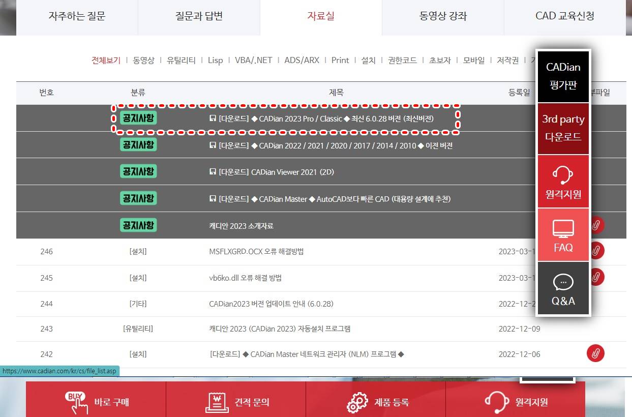 자료실의 화면에서 5개의 공지사항에 필요한 캐디안 소프트웨어를 선택해 다운로드하면 됩니다. 일단 CADian Viewer2021부터 사용해 보세요. 그럴 이유는 없겠지만 혹시 마음에 들지 않으면 Uninstall 할 수도 있으니 가볍게 접근해 보는 것도 좋겠죠.