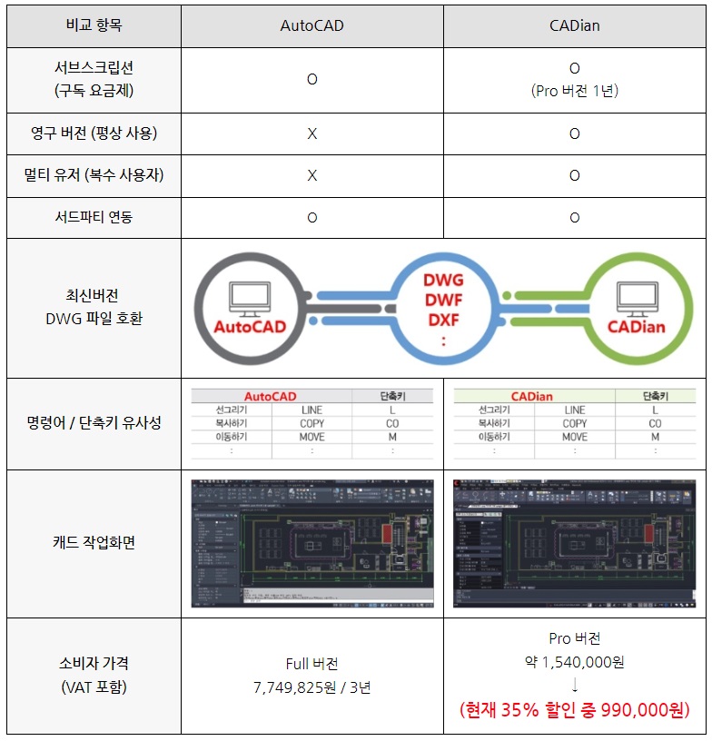 그리고 멀티유저(복수사용자)가 가능해야 업무 효율도 오르지 않을까 싶습니다. 그리고 문제는 가격이죠. 캐디안 Pro버전 3년 기준으로 보면 오토캐드 보다 약 1/2 정도의 가격으로 사용할 수 있으니 직원 수에 따라 적지 않은 비용을 줄일 수 있습니다. 더구나 캐디안 Pro는 현재 35% 할인 중이니 좋은 기회가 아닐까 싶습니다.