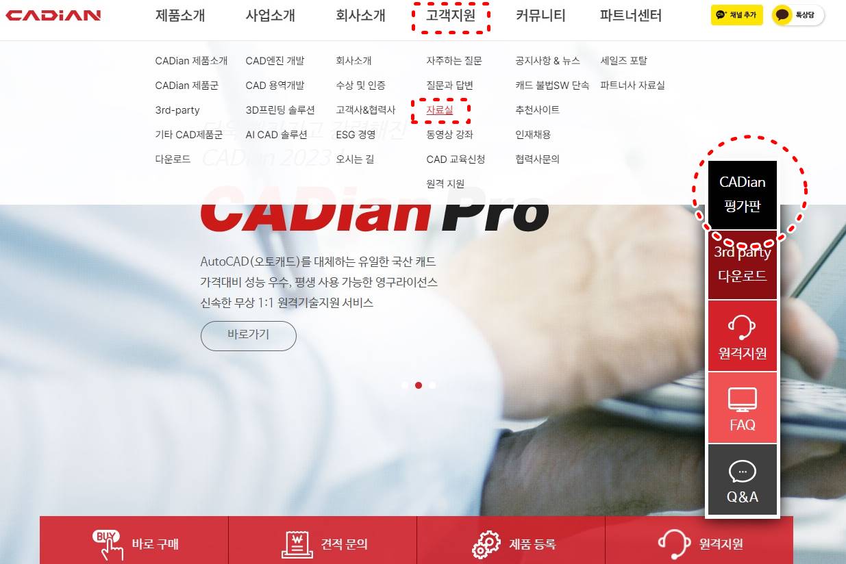 우선 캐디안(CADian) 홈페이지(바로가기)에 접속한 후 상단의 메뉴 중 중간에 있는 고객지원 메뉴에서 중간에 있는 자료실을 클릭합니다. 또는 좌측에 있는 배너의 CADian 평가판을 클릭해도 됩니다.