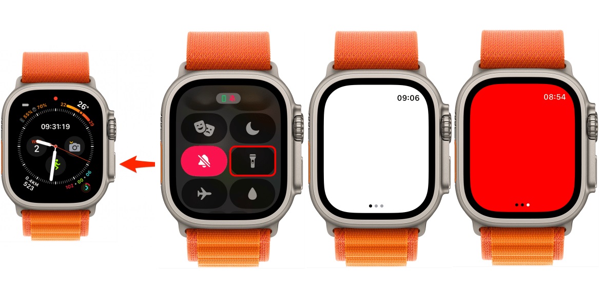 아이폰의 손전등에 비해 애플은 워치에도 손전등이 있다는 사실을 생각만큼 잘 알리려고 하지 않았기 때문이 아인가 싶기도 합니다. 애플워치의 측면 버튼을 누른 다음 손전등 아이콘이 나타날 때까지 화면을 아래로 살짝 밉니다.