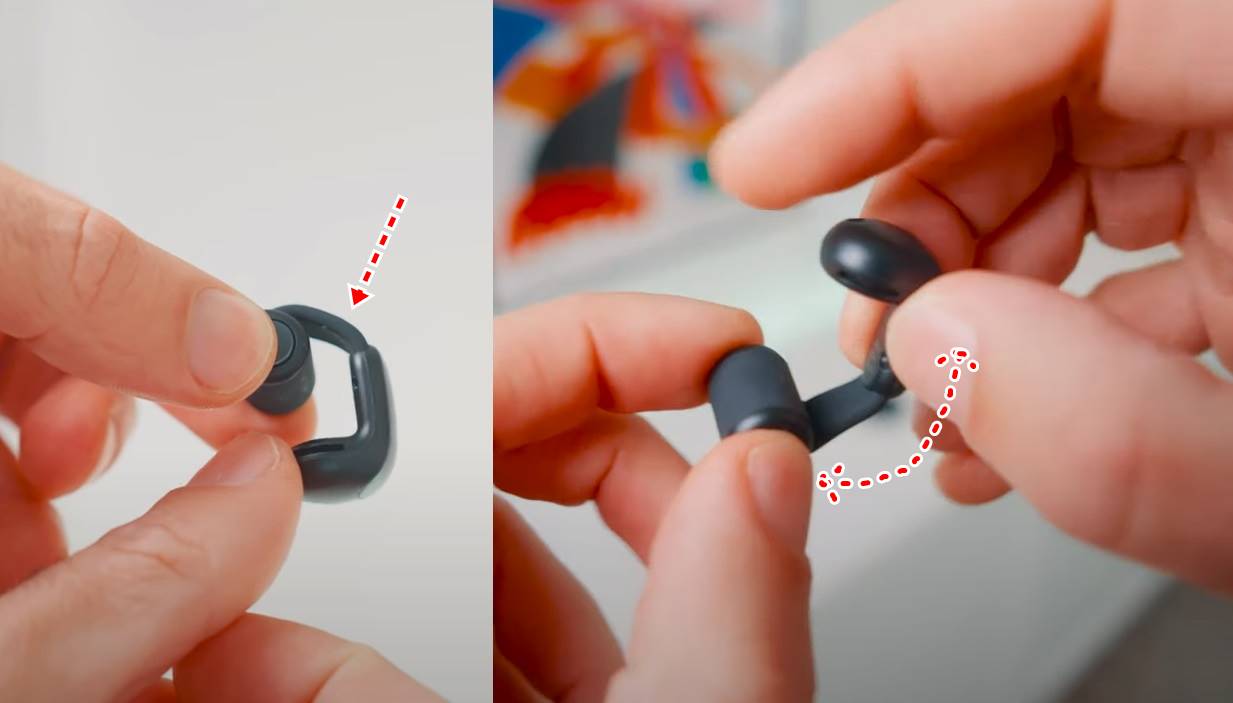 보스 울트라 오픈 이어버드는 귀에 쉽게 착용할 수 있도록 신축성 있는 고무 재질로 배럴과 연결되어 있어 좌우 또는 상하로 벌려서 착용할 수 있습니다. 이미지에서 보듯이 생각보다 신축성이 높아 착용하거나 탈착 하는데 문제가 없겠죠.