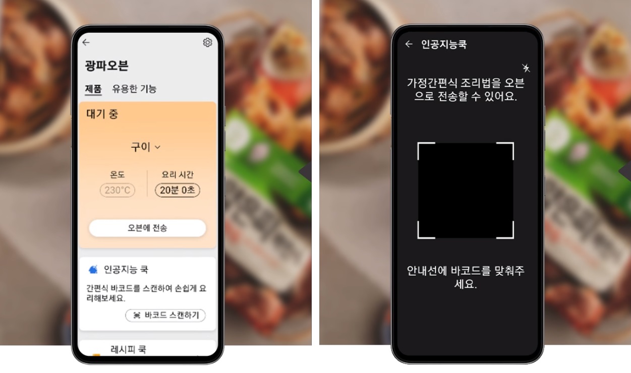 그밖에 사용빈도가 많은 레인지, 오븐, 에어프라이, 해동 등 기본 기능을 제외한 나머지 요리 기능은 씽큐 앱에서 추가, 삭제, 순서를 변경해 맞춤형으로 관리할 수 있어 심플하게 화면을 구성하고 편리하게 이용할 수 있습니다. 요리를 편하게 하기 위해 제휴된 업체들의 가정간편식에 있는 바코드를 찍으면 광파오븐이 자동으로 최적의 조리법을 찾아줍니다.
