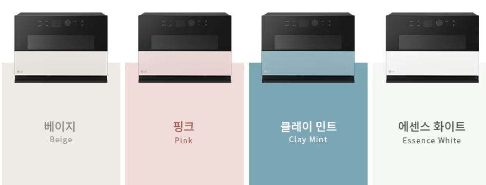 컬러는 카밍 베이지, 카밍 에센스 화이트, 카밍 클레이 민트, 카밍 핑크 등 4가지로 선택의 폭이 다양합니다. 뿐만 아니라 엘지 디오스 오브제컬렉션 광파오븐의 전면 패널 컬러는 사용자의 니즈에 맞게 교체할 수도 있습니다. 다만 핑크 예쁘기는 하지만 식욕을 억제하는 컬러로 알고 있어 애매한 듯 합니다.