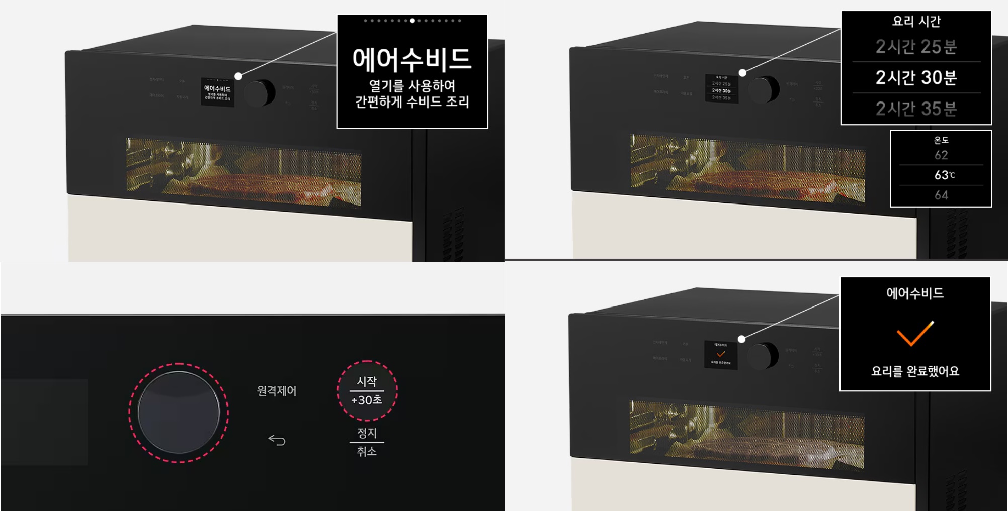 수비드 조립법에 대해 좀 더 알아보면 진공 포장된 식재료를 광파오븐에 넣고 에어수비드 기능의 온도를 설정하면 오븐이 해당 온도의 공기를 일정하게 내보내 음식을 천천히 골고루 익혀줍니다.