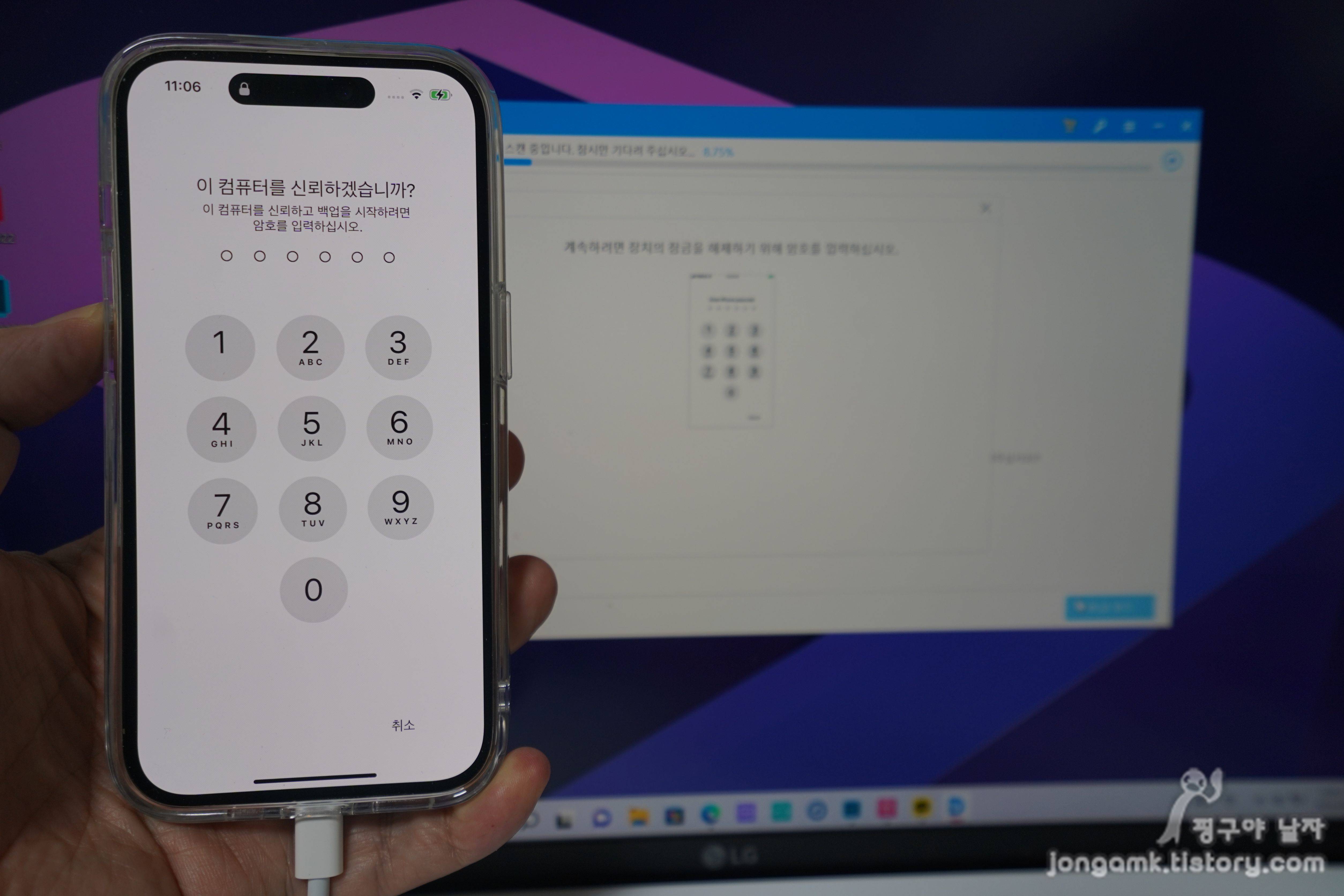 3단계는 테너쉐어 얼트데이터 프로그램이 카카오톡 데이터를 스캔하는 중입니다. 카톡 복구 데이터의 크기에 따라 복구 시간이 차이가 있을 수 있습니다. 화면에서 잠금해제를 위한 암호는 입력해야 합니다.