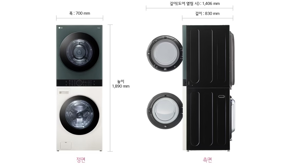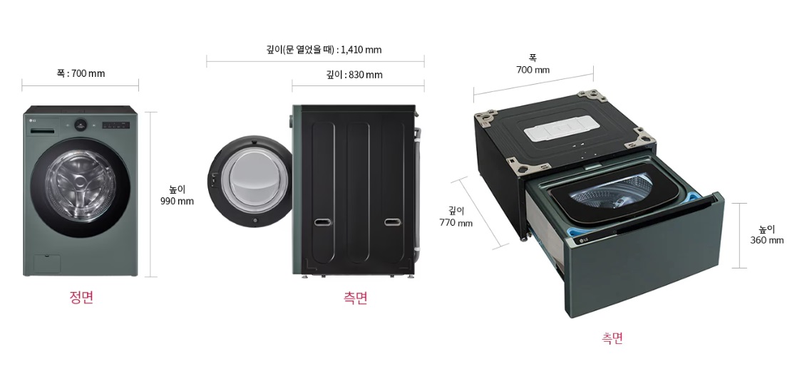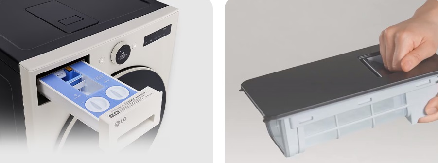 슬라이드 먼지 필터로 먼지를 간편하게 제거할 수 있고 자동세제함이 상단에 있어 허리를 굽히지 않고 편하게 세제나 섬유유연제를 투입할 수 있도록 디테일하게 신경을 썼습니다. 대용량 빨래를 자주하는 분들응은 세탁기 위에 건조기를 결합한 원바디 제품 워시타워를 사용하면 좋고 상단의 공간확보가 어려운 경우 세로나 가로 모두 설치할 수 있는 트롬 세탁기와 건조기 세트를 사용하면 되겠죠.
