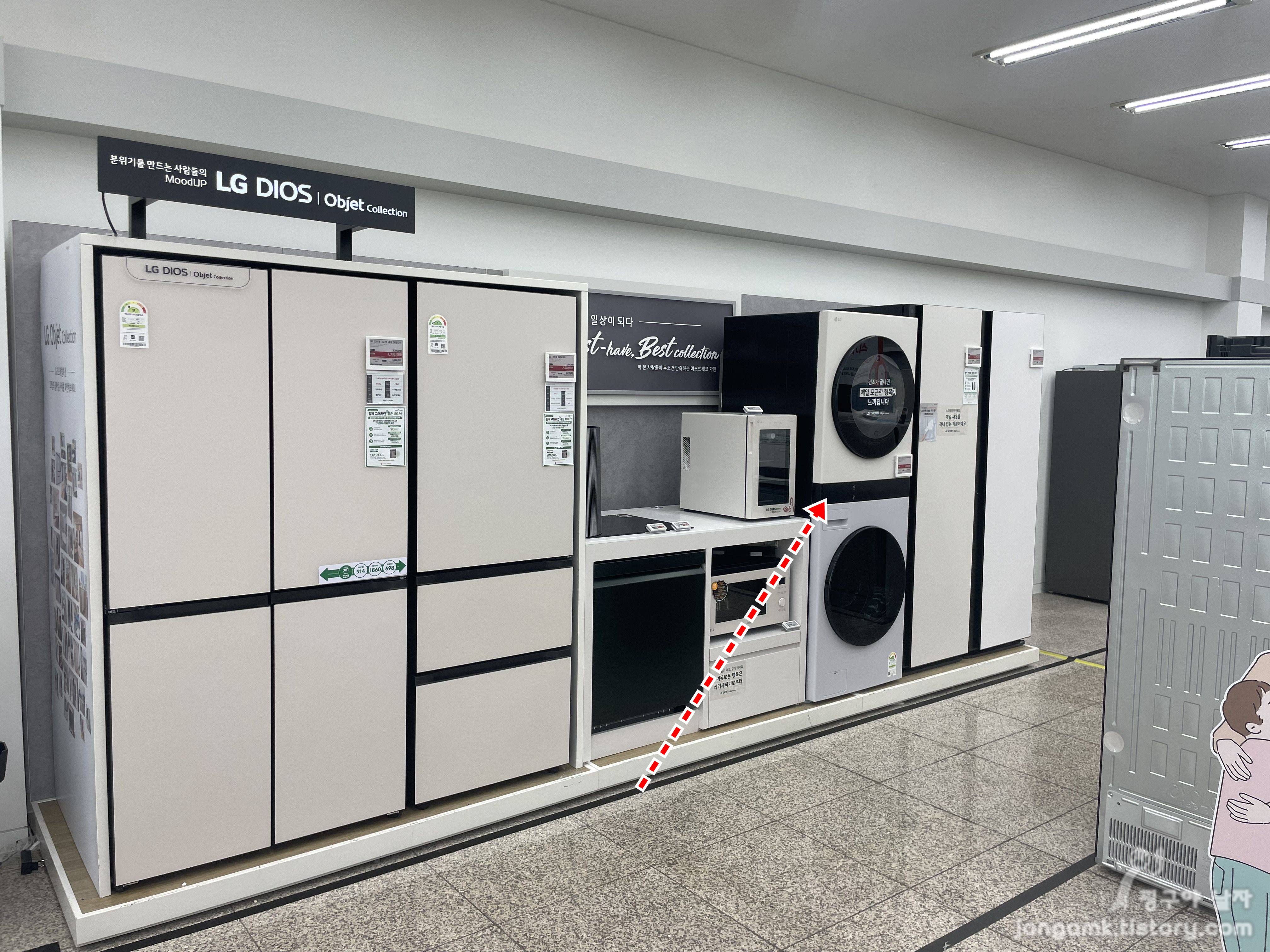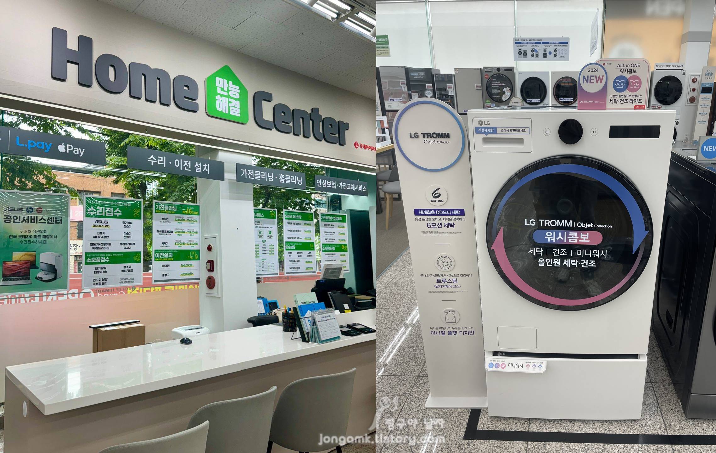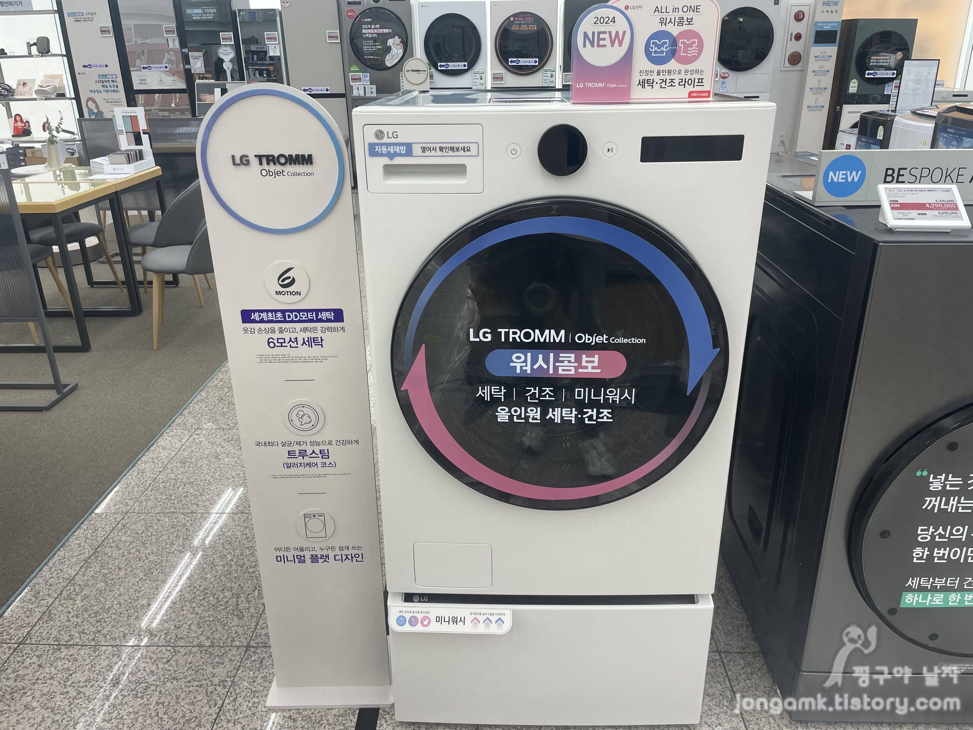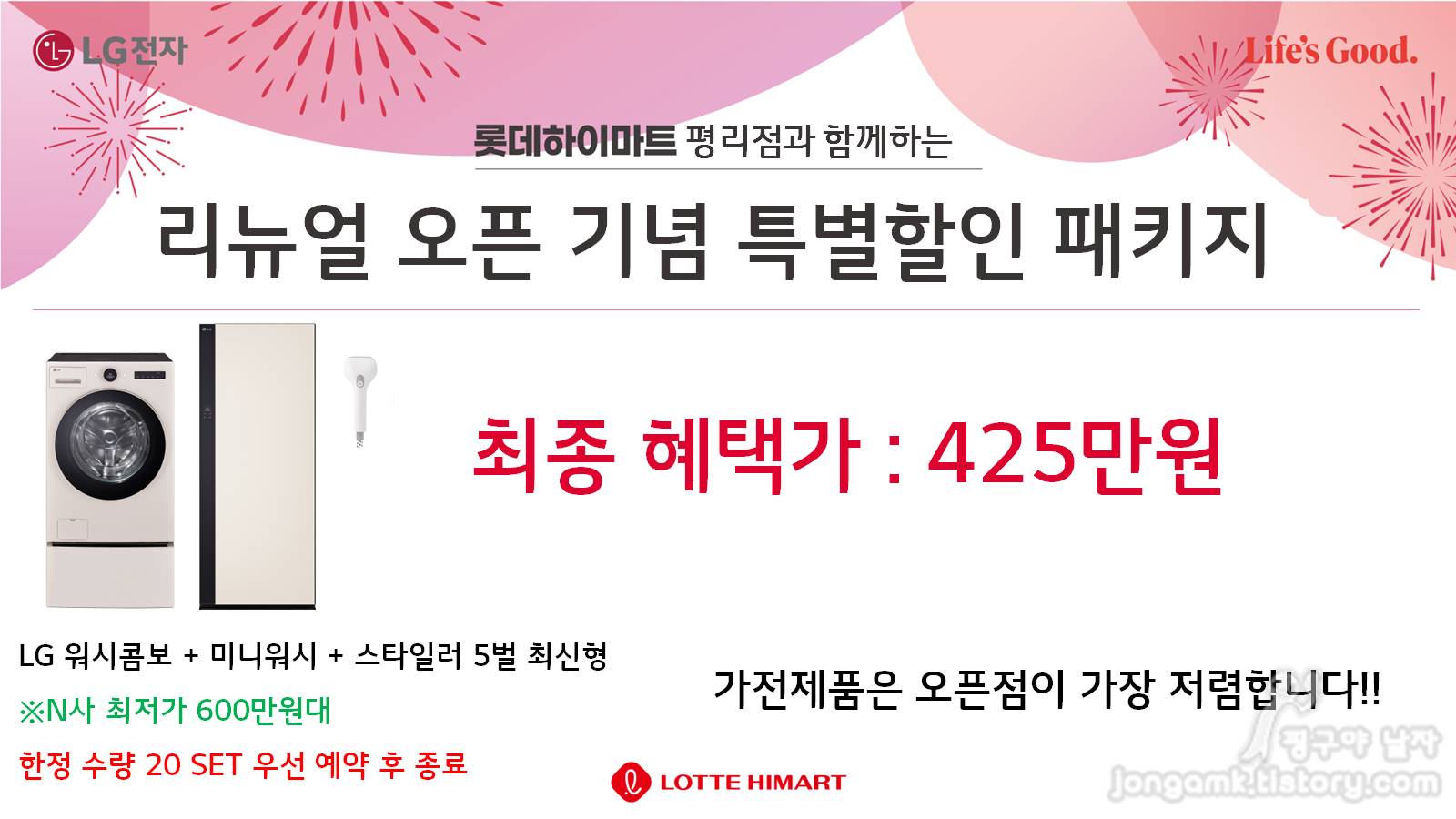 가격은 판매점별로 차이가 있겠지만 N사의 경우 엘지 세탁건조기 워시콤보(미니워시 FH25EAX)와 스타일러 5벌 최신형(SC5MBR81H) 세트가 600만원 정도 하는 것으로 알려져 있는데요. 롯데하이마트 평리점은 리뉴얼 오픈 기념으로 425만원에 판매하고 있습니다. 확실한 가격 차이를 보이고 있죠. 아쉬운 것은 20세트 한정 수량이라는 겁니다.