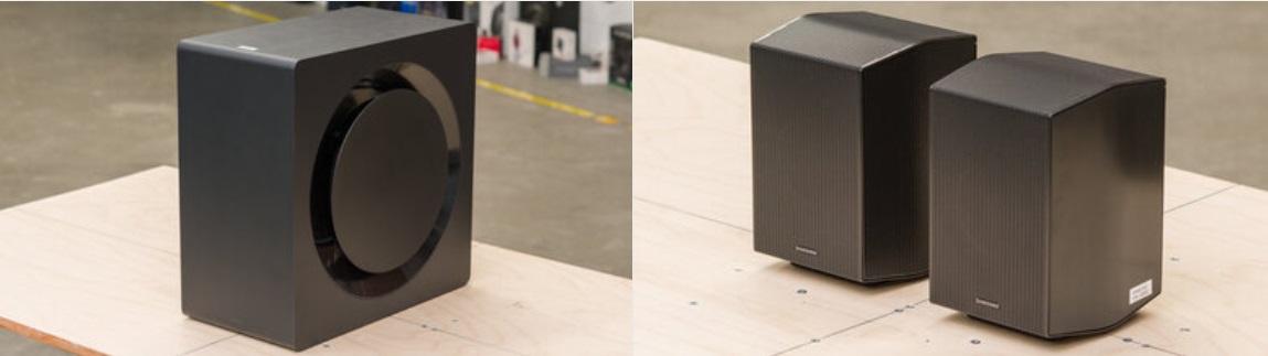 삼성 사운드바는 전작 HW-Q990C와 동일해 보이지만 각진 측면과 금속 그릴로 되어 있으며 바 오른쪽에는 LED 디스플레이가 있습니다. 서브우퍼는 서브 무선을 지원합니다. 새틀라이트도 사운드바와 같은 재질입니다.