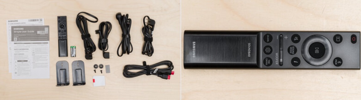 HW-Q990D의 구성품은 사용자 매뉴얼, 배터리 포함 리모컨(AAA 2개) 4x 고무발, 벽걸이 가이드, 사운드바용 벽면 장착 브래킷 2개, 홀더, 나사(x2) 및 나사(x2) HDMI 케이블(2m/6.6피트) 4x 전원 케이블(2.25m) 등이 있으며 출시국에 따라 차이는 있을 수 있겠죠.