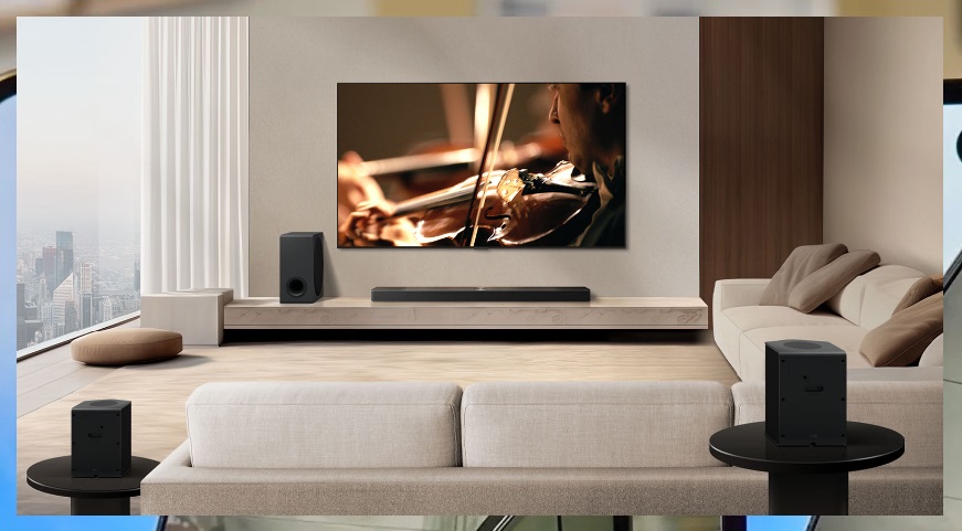 기존보다 4배가 강화된 인공지능으로 탑재된 알파11 AI 프로세서 덕분에 그래픽 성능은 70%, 프로세싱 속도는 30% 향상되어 더 선명한 화질과 풍성한 공간 음향을 제공하고 있습니다. 또한 2024년형 LG 사운드바는 초대형 TV 화면에 걸맞은 입체 사운드 AI 기반으로 풍부한 입체 사운드를 강화했습니다.