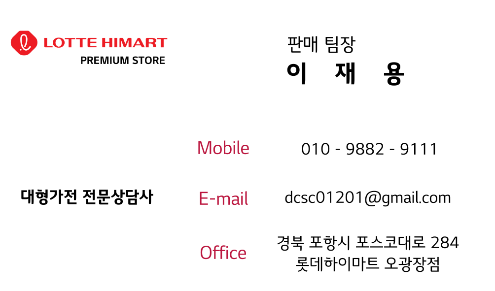 PC 모니터나 스마트폰으로 보는 것과 포항 롯데하이마트 오광장점과 같은 오프라인 매장에서 직접 보는 것은 차이가 있거든요. 더구나 입주할인지정점이니 다른 매장보다 혜택이 더 있지 않을까 싶습니다.