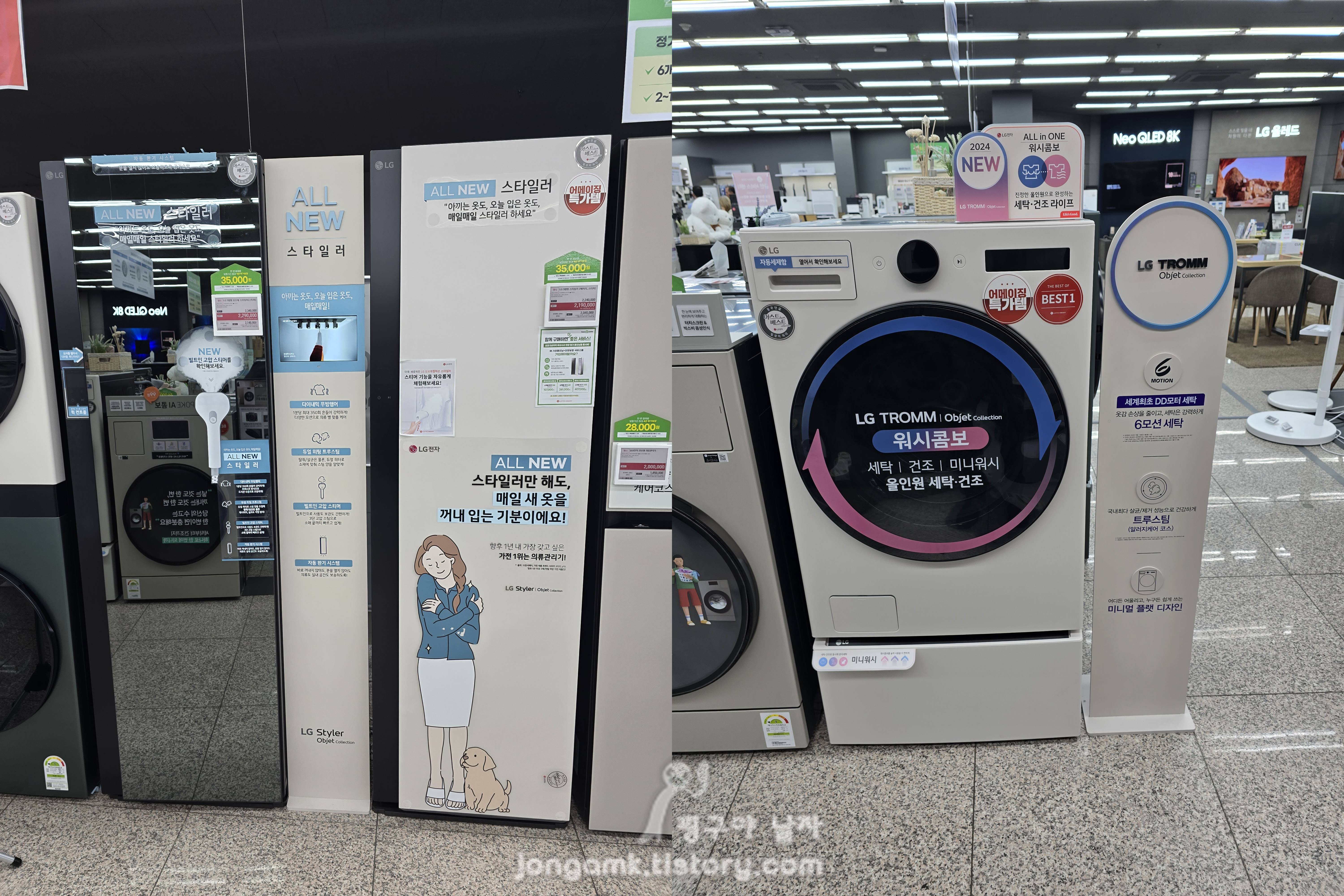 단독건물로 다양한 가전제품이 1층부터 3층까지 있으니 구경삼아 방문해 보는 것도 좋을 것 같아요. 엘지 오브제컬렉션 세탁건조기(FH25EAX)와 스티머 스타일러(SC5MBR81H) 싸게 사는법도 확인하고 그밖에 요즘 가전제품은 어떻게 나오는지 실제로 살펴보면 도움이 되지 않을까요.