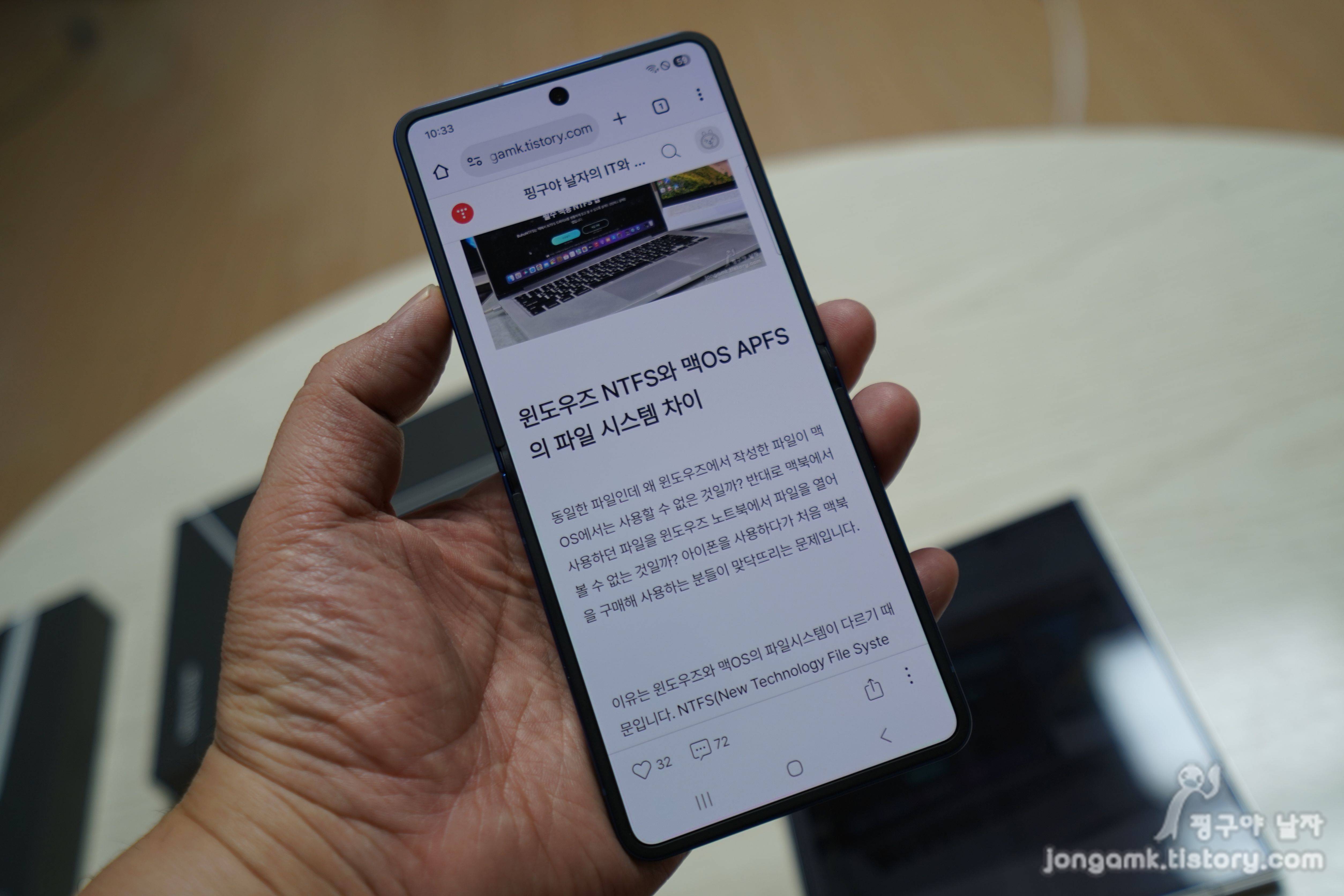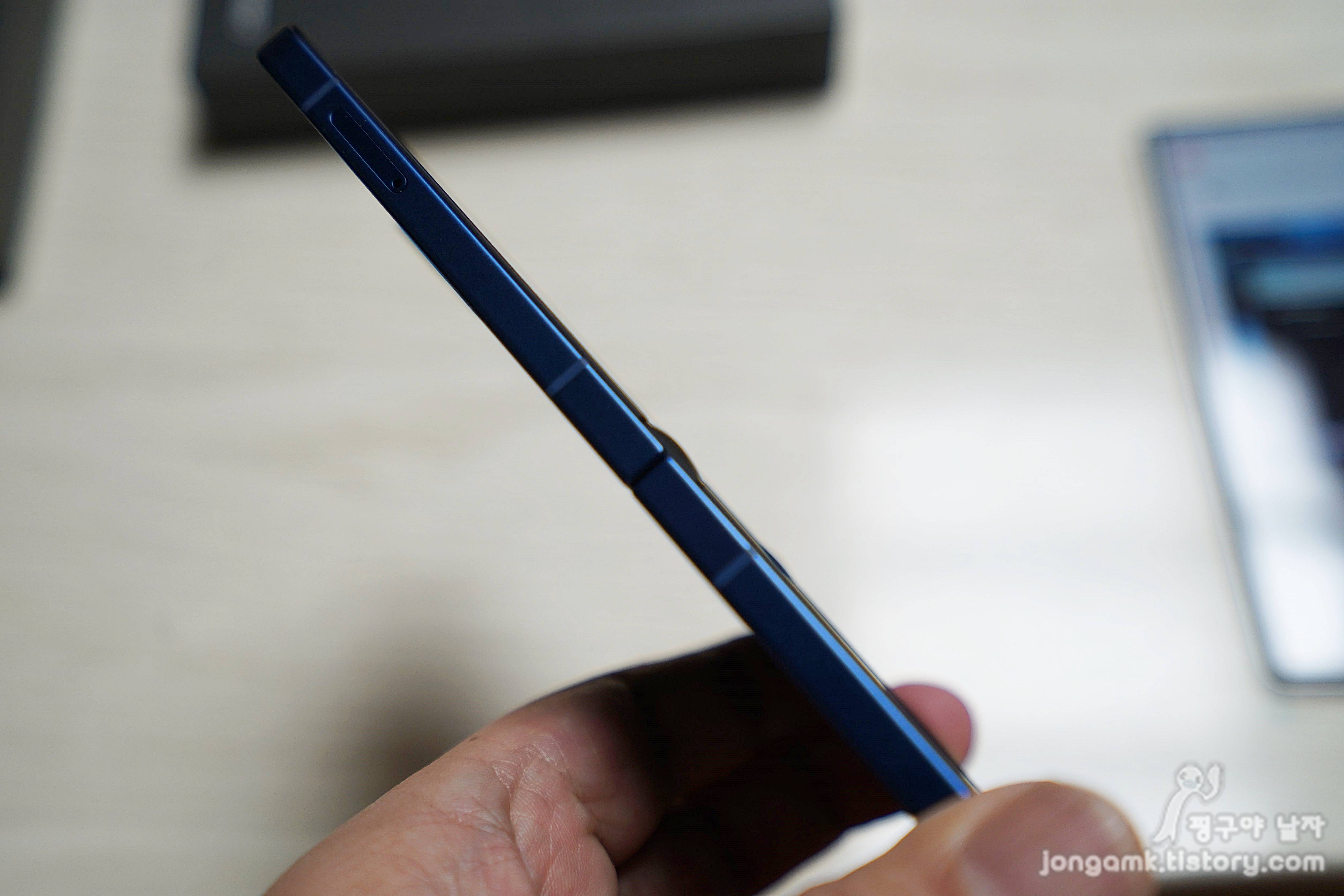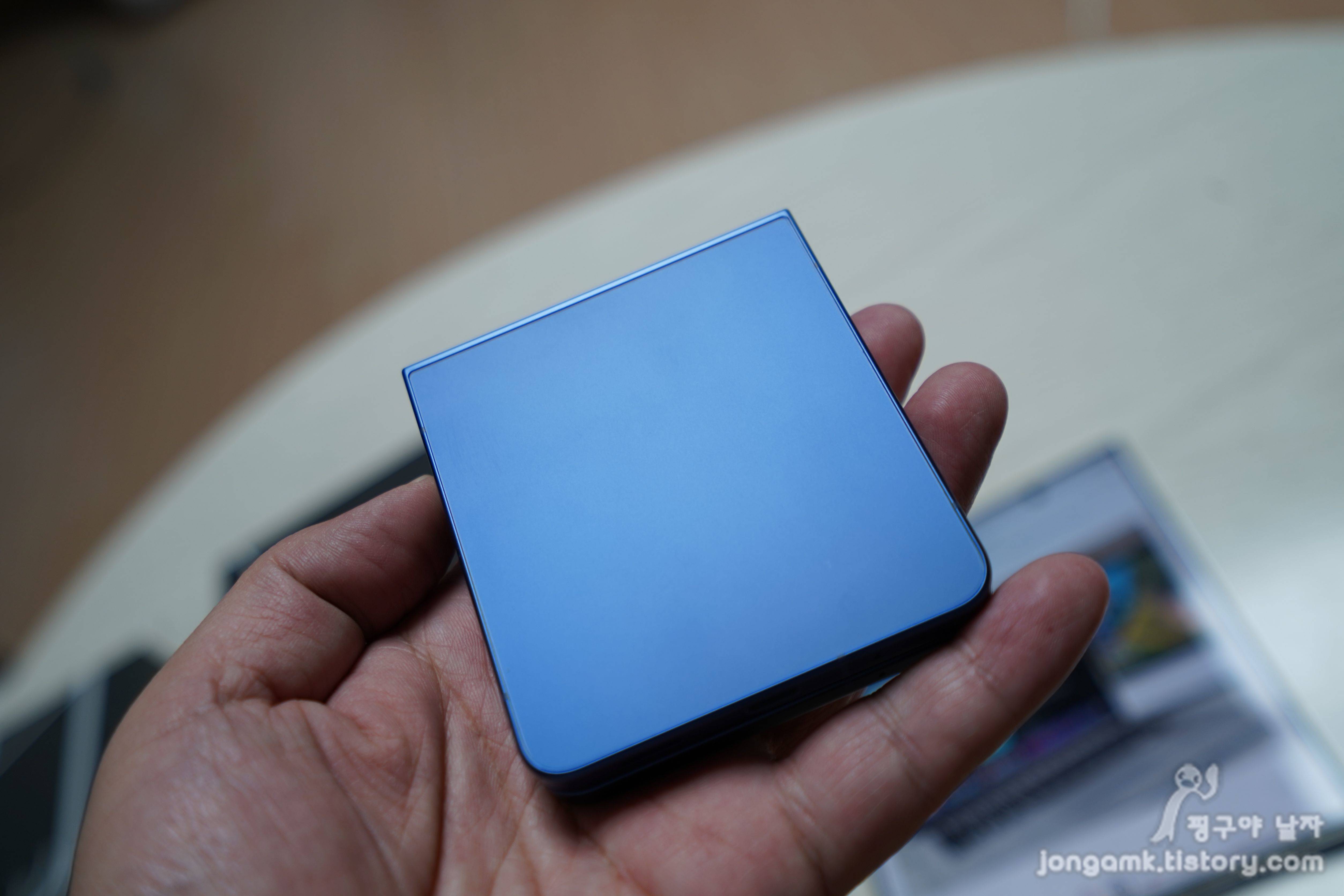 색상도 블루 쉐도우, 제트 블랙, 코랄 레드를 출시해 취향껏 선택하면 될 것 같아요. 개인적으로는 블루 쉐도우가 마음에 들었어요. 디자인을 완성하는 색상도 갤럭시 플립7의 매력 중 하나입니다. 블루 쉐도우는 트렌디하고 시크하게, 제트 블랙은 클래식하면서 고급스럽게, 코랄 레드는 포인트 컬러로 개성 있게. 각각의 컬러는 보는 것보다 실물로 마주했을 때 훨씬 세련된 느낌을 줍니다. 취향껏 선택하면 될 것 같아요.