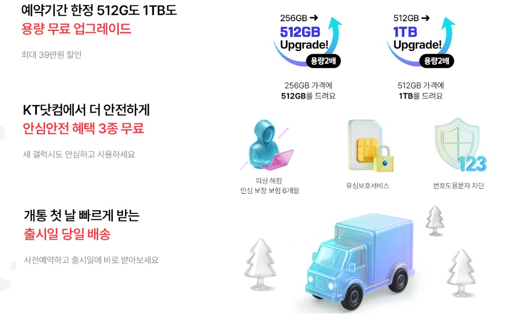 단순히 갤럭시Z 플립7이나 갤럭시Z 폴드7을 먼저 사는 것이 아닙니다. KT닷컴의 사전예약은 가격, 혜택, 서비스, 사후 보안까지 완성도 높은 고객 경험을 제공하기 때문에 고성능 디바이스를 더 저렴하게, 보안과 서비스까지 챙기며 누구보다 먼저 안전하게 받아보는 방법을 KT닷컴과 함께 해 보세요. 아래 사항을 참고하시면 도움이 될 수 있습니다.