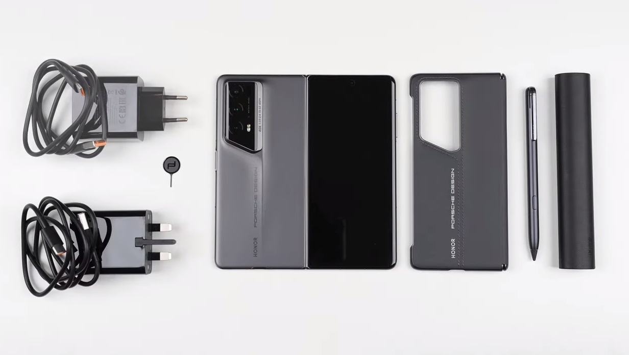 아너 매직 V2 RSR 포르쉐의 구성품은 포르쉐 디자인 케이스, 충전기 두 개, 케이블 두 개, 스타일러스 펜, 그리고 전용 케이스가 포함되어 있는 고급스러운 패키지로 제공됩니다. 케이스는 기대 이상으로 얇은 스티치 가죽 케이스입니다. 아너 매직 V2 RSR 포르쉐 디자인은 디자인은 고급스럽지만 소프트웨어는 걸맞지 않아 아쉬움이 있습니다.